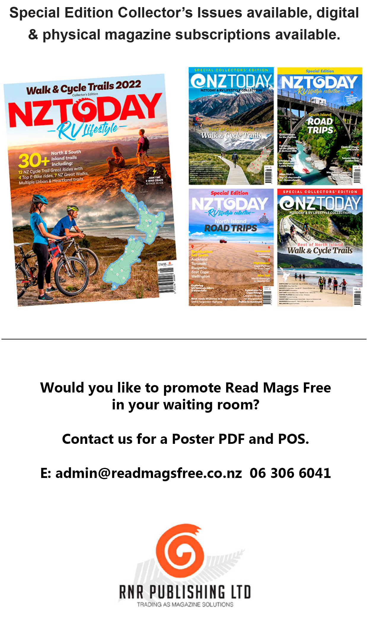Below you will find a choice of quality, engaging reading by New Zealand writers who share their personal travels and experiences around our beautiful country in NZToday. RV lifestyles can be explored, reviews of classic caravan restorations through to half million dollar motorhomes, plus road trips and destinations, heartland rural villages and back roads of our country are explored. The MTA 100 Centenary publication, celebrating 100 years of the Motor Trade Association 1917-2017 is available to read for a limited introductory period. Read the history of the Centenary of Australian Submarines 1914 - 2104 Collector’s Edition free for a limited period.